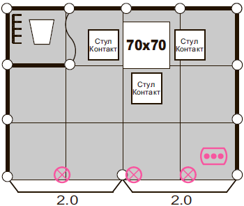 - Стены по периметру - Ковровое покрытие - Название компании на фризовой панели - 4 стула - 1 стол 70х70 - 4 светильник “спот-бра” - 1 элемент стены - 1 дверь гармошкой - Корзина для мусора - Вешалка настенная - 1 блок розеток 220 В |
